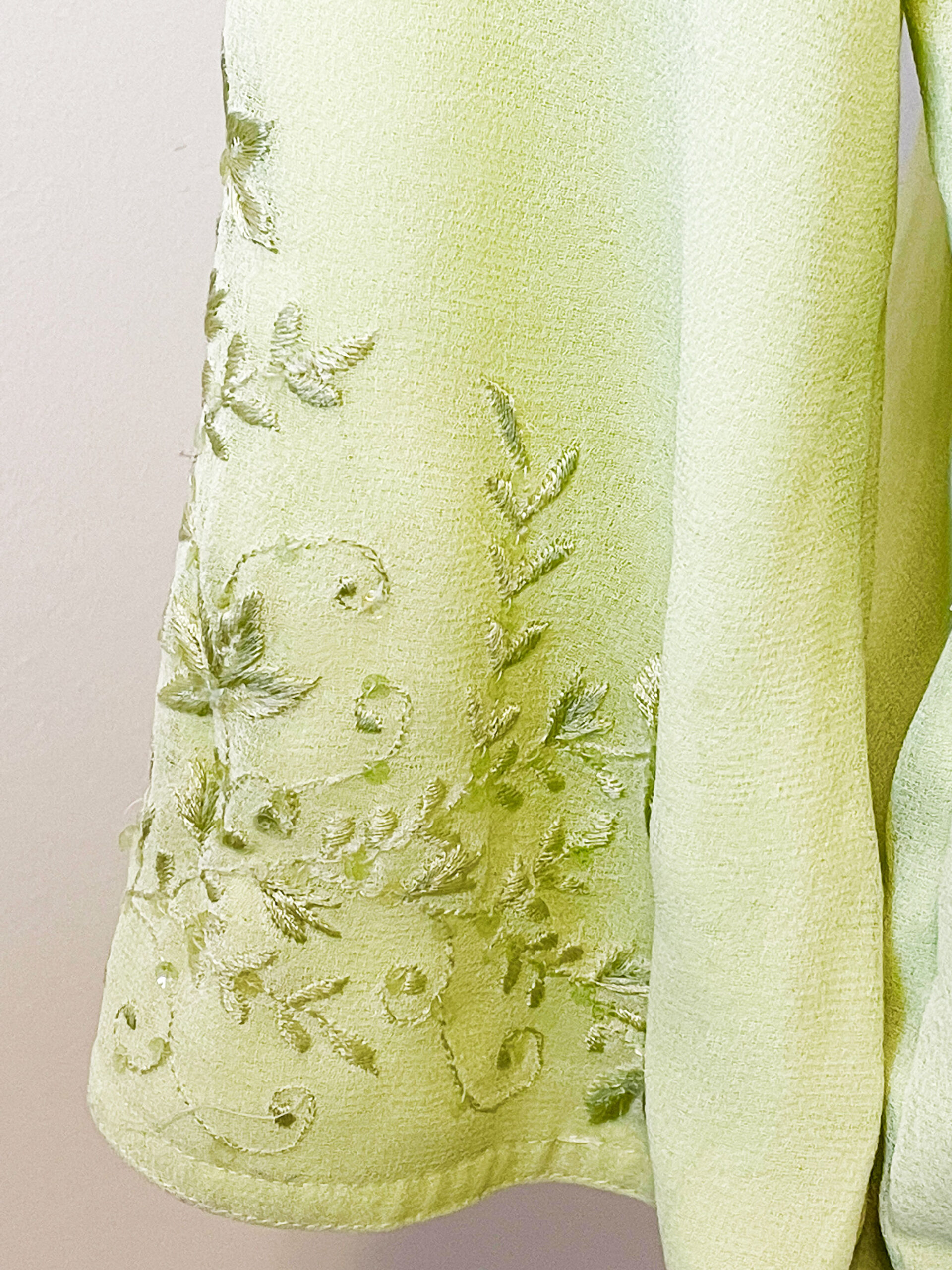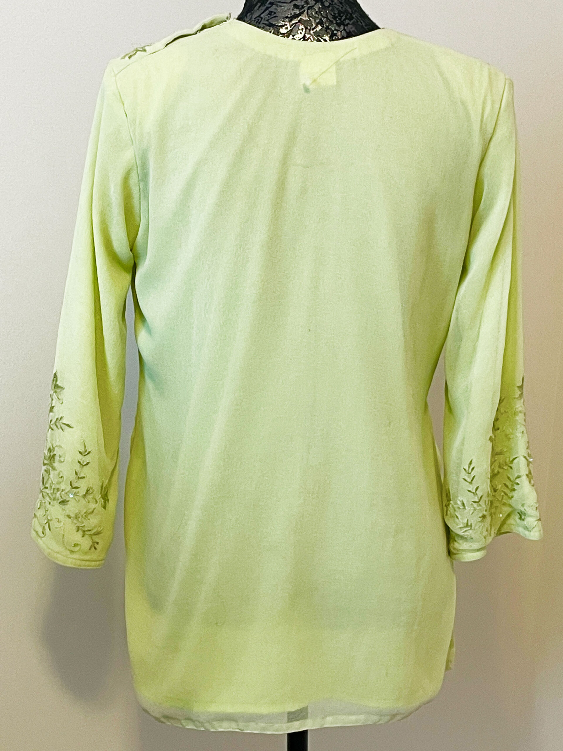 Chiffon georgette short Kurti/Tunic/Top in lime green colour with delicate embroidery work all over, fully lined and ideal for casual or evening wear.