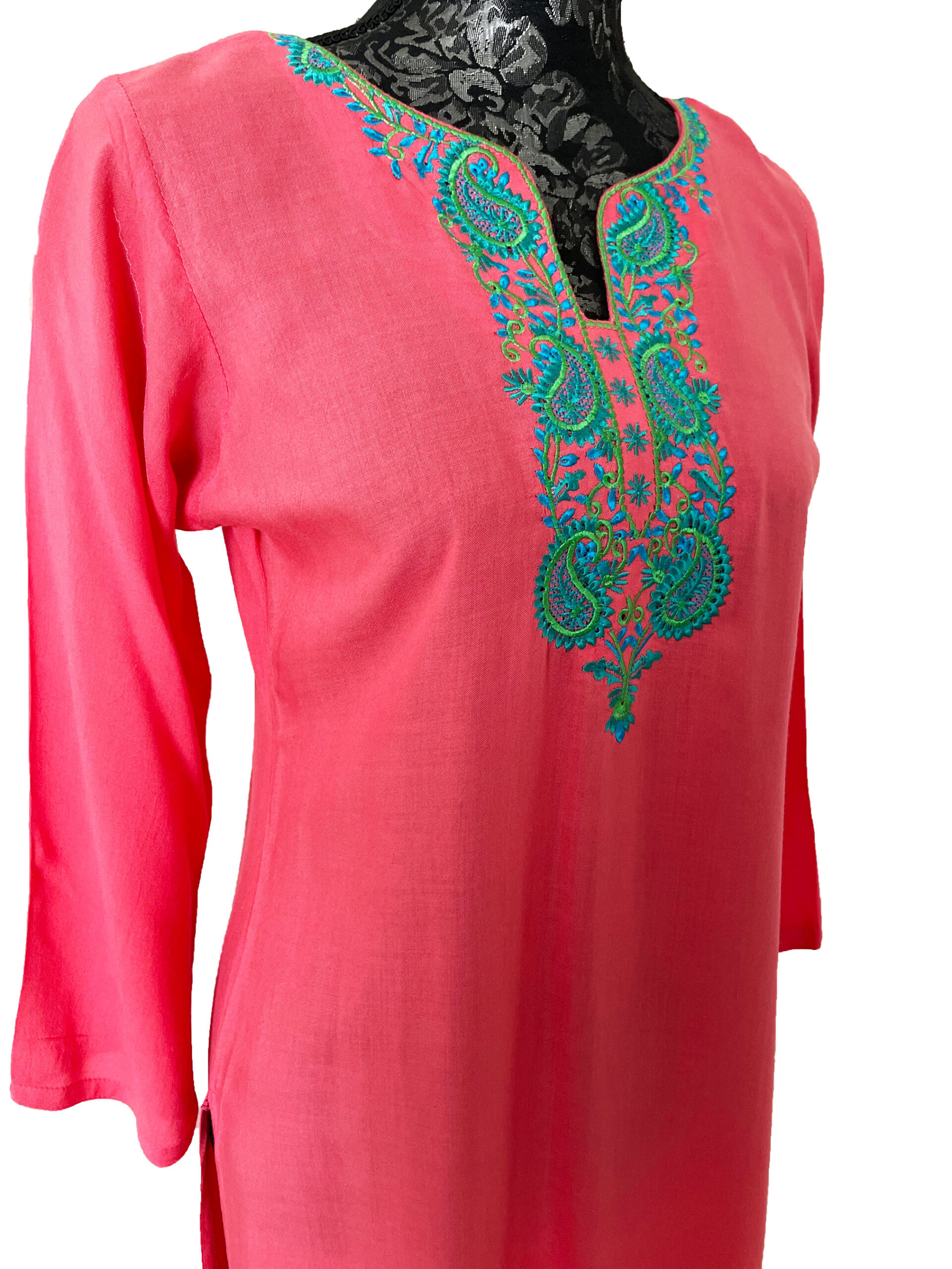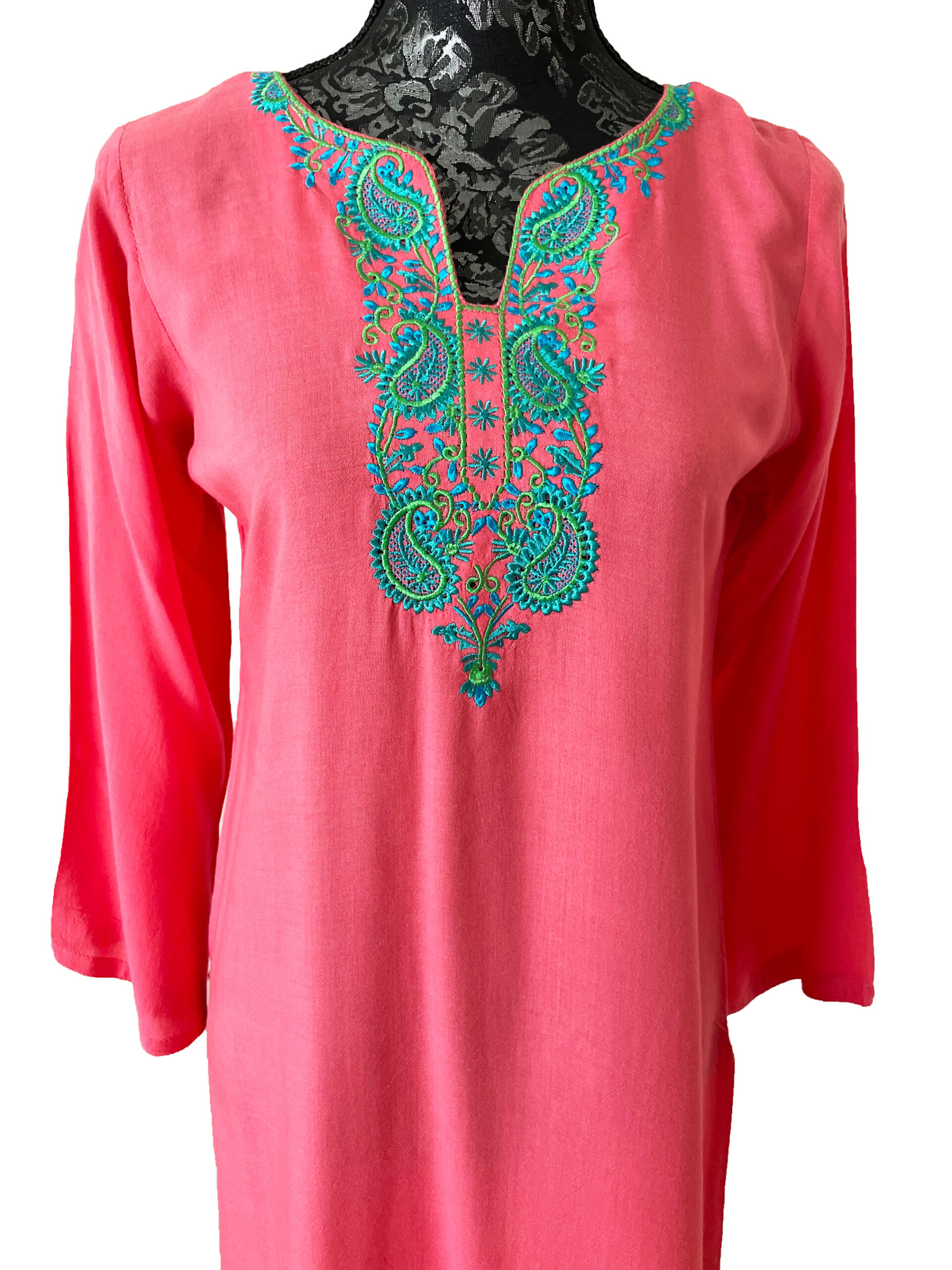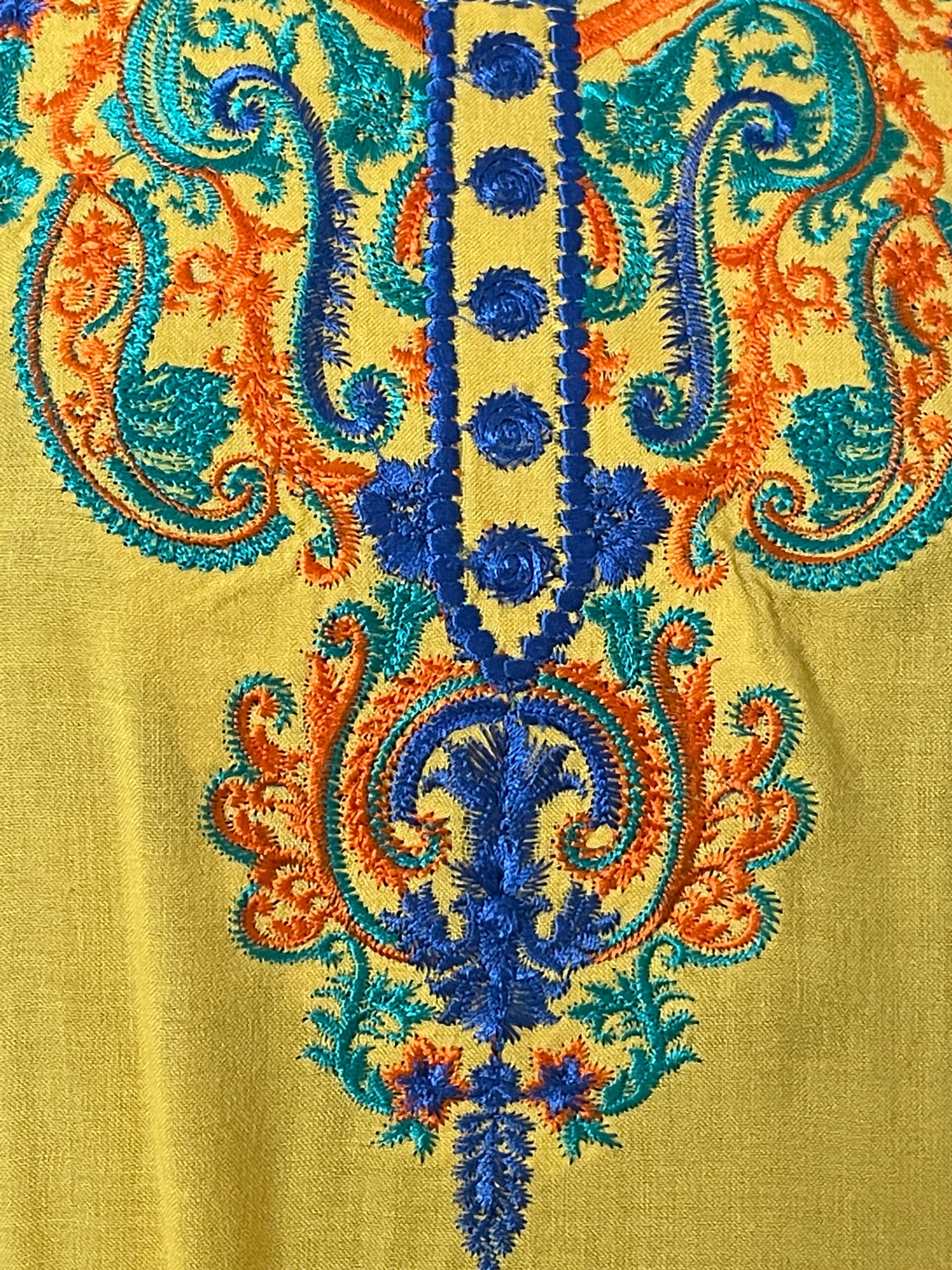 Beautiful embroidered Kurti Tops, Long Tunic dresses in sunshine yellow and brick orange colours with elegant embroidery ideal for casual or evening wear.