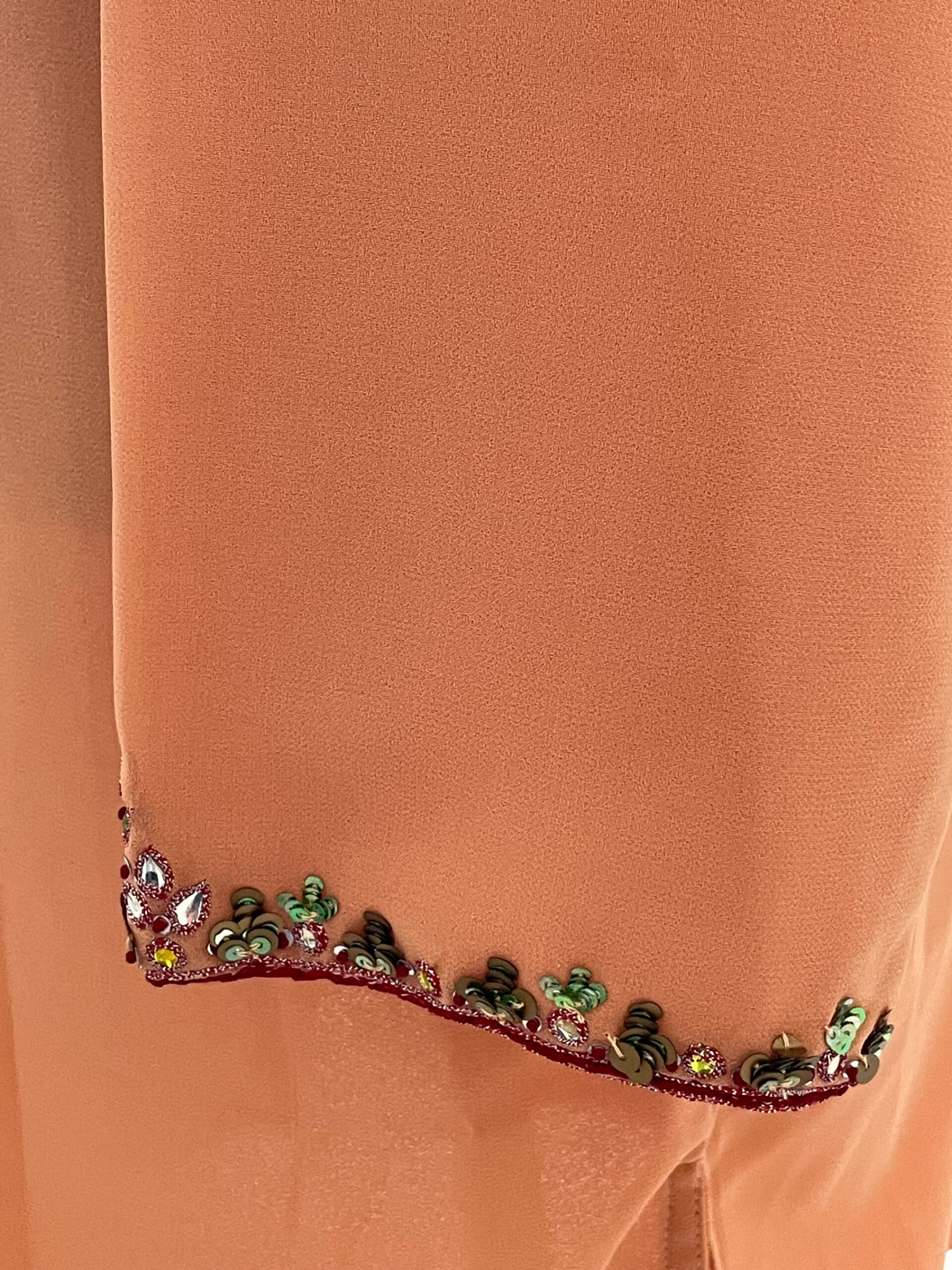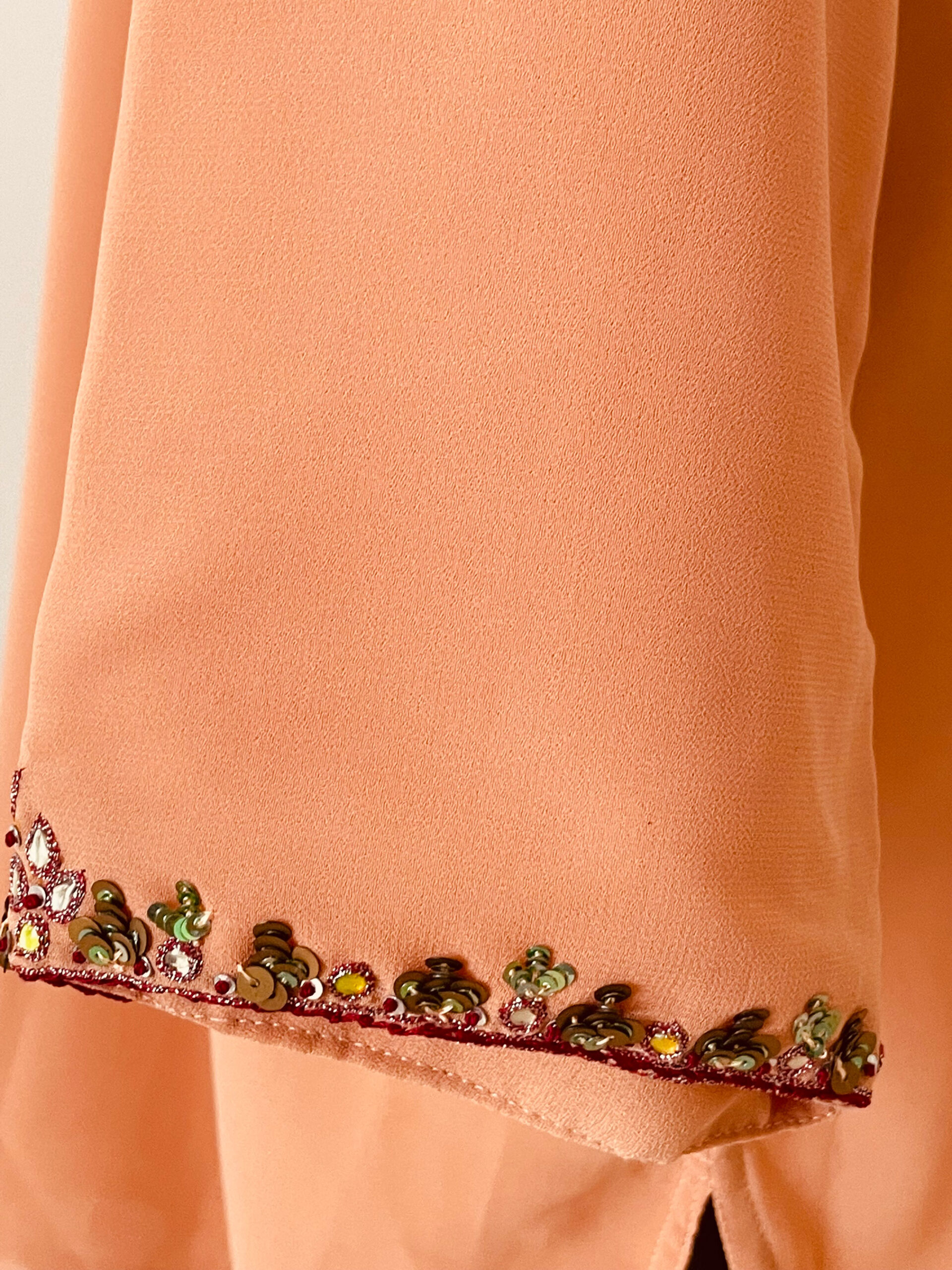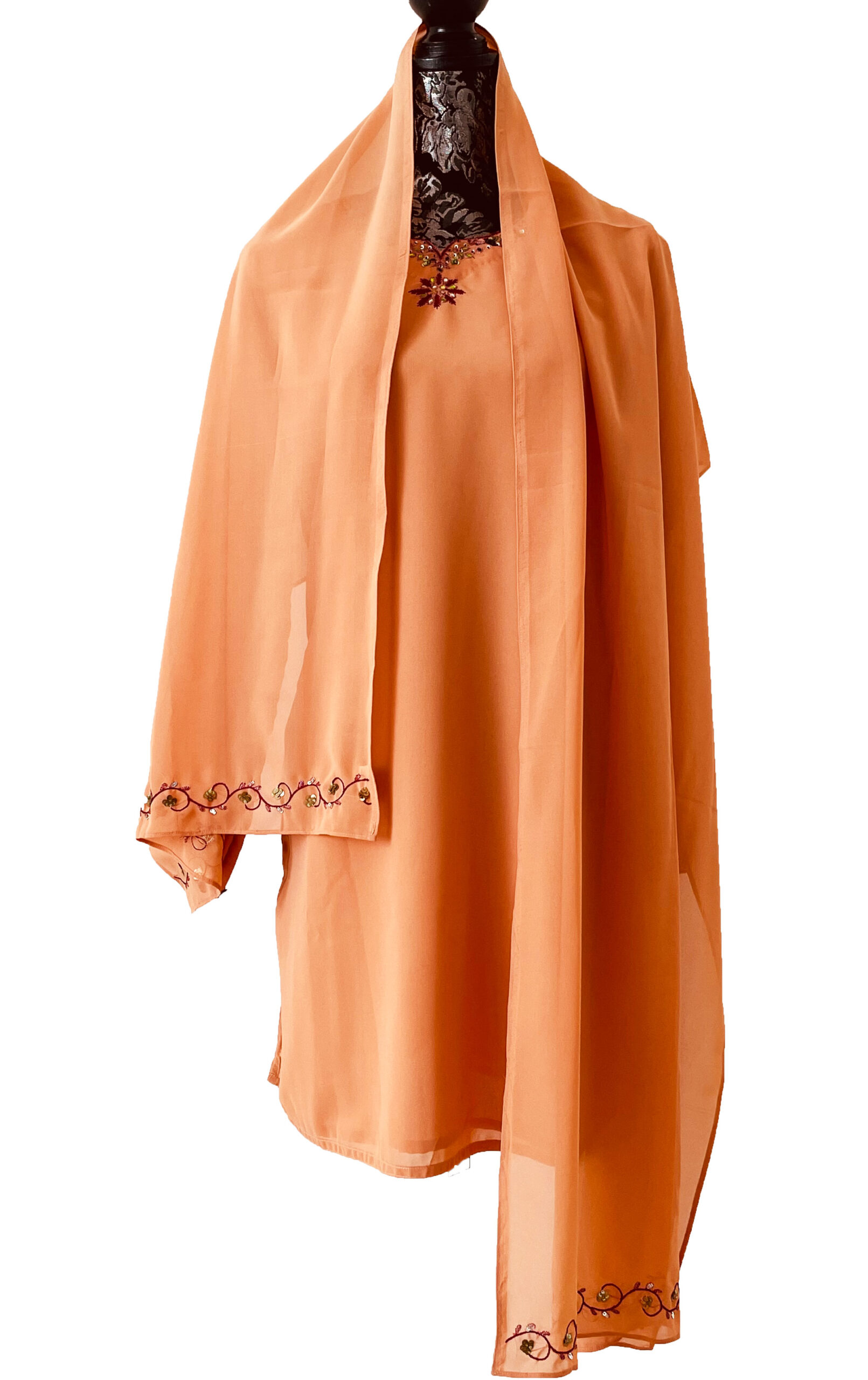 Beautiful embroidered short Kurti/Tunic/Top in desert sand colour with subtle embroidery, ideal for casual or evening wear. Has complete inner lining. Matching Scarf / Hijab with beautiful delicate embroidery also available but not included.
